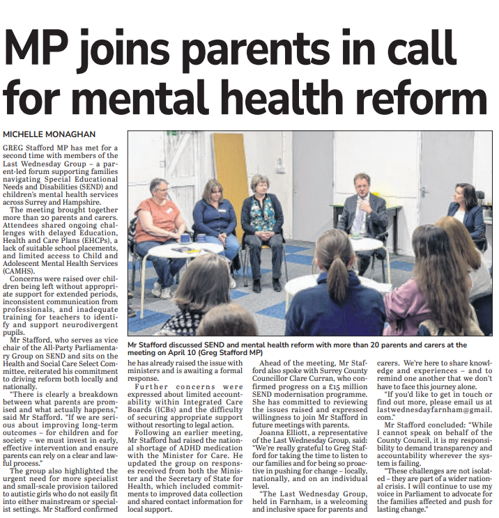 In April 2024, Greg Stafford MP met with the Last Wednesday group for the second time. He joined more than 20 parents and carers to discuss urgent concerns around delays in EHCPs, school placements, and children’s mental health services.